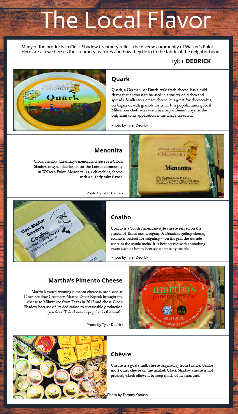 Among the run-down, abandoned buildings once used for manufacturing on Second Street, the modern Clock Shadow Building looks like something from a distant future. Daylight streams through large, open windows. The wood siding, reclaimed from pickle barrels, creates a dichotomy between the chic and the traditional that is accentuated within the urban cheese factory’s glass doors. Step inside the creamery, and customers are greeted with the gentle scent of dairy. Patrons are only reminded they’re in the heart of Wisconsin’s largest city if they look out the window.