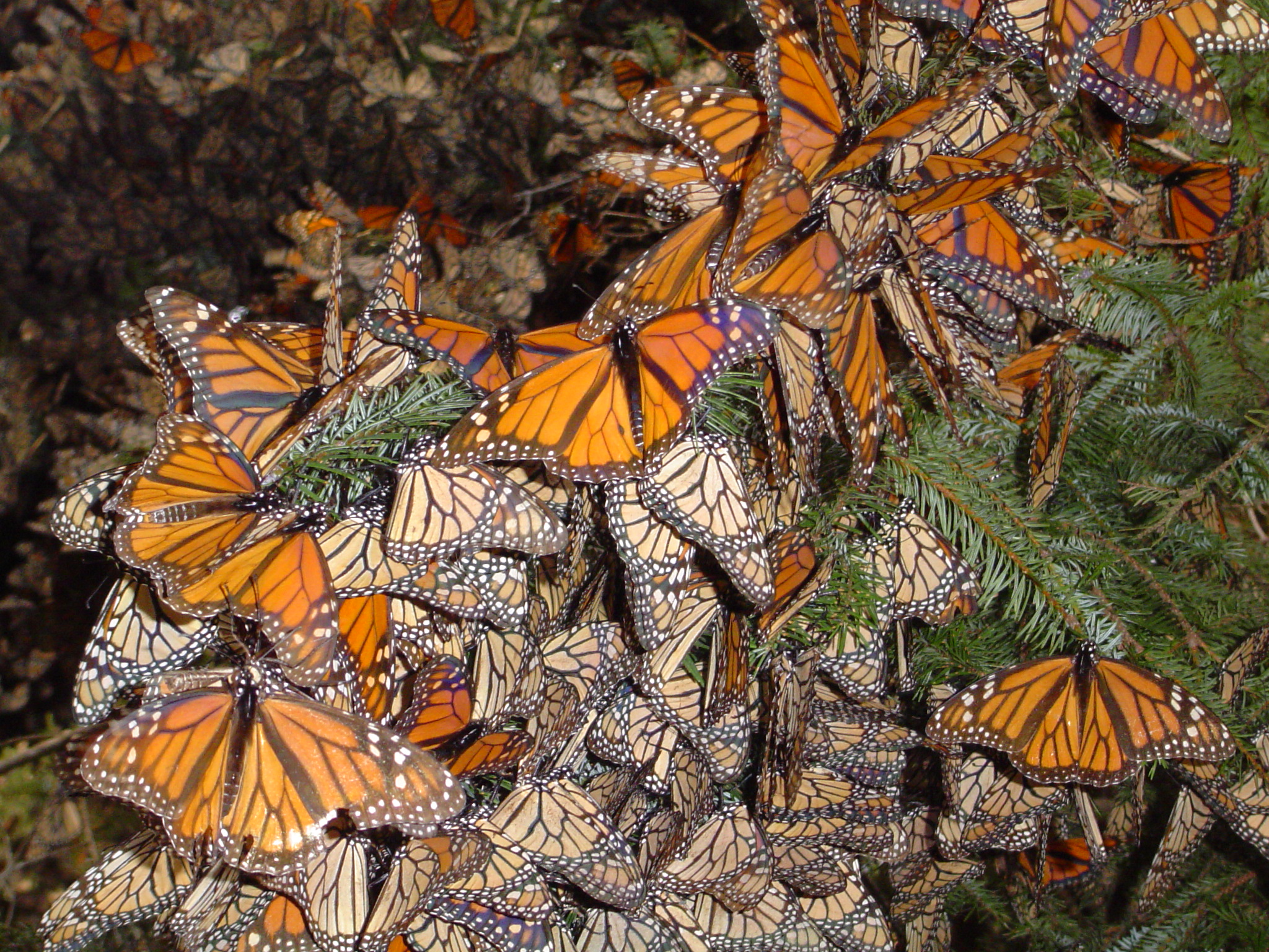 By December, the monarch reaches her destination in the mountains of Central Mexico. With thousands of monarchs from other northern origins, she will now form a dense butterfly cluster on an oyamel fir. In a microclimate maintained by an insulating canopy of these firs, she will spend most of the next 12 weeks in a semi-dormant state. She only interrupts her torpor to seek out water, which converts her stored abdominal fats into sugars, releasing energy for respiration.