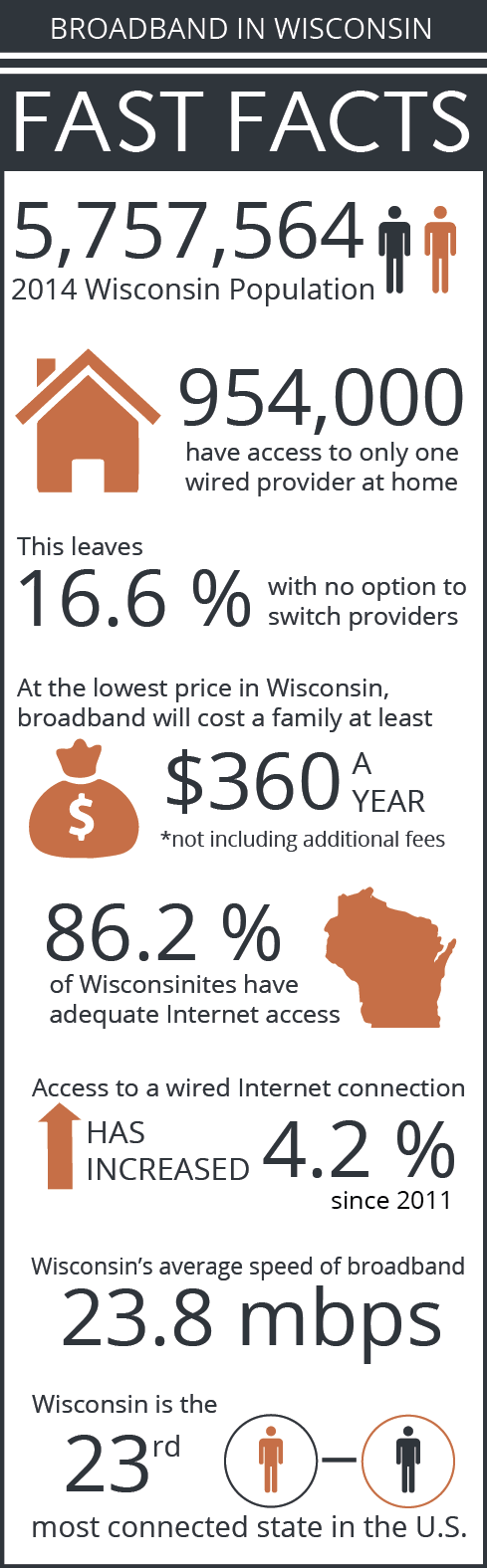 Wisconsin does pretty well when it comes to getting people online. According to BroadbandNow, a website that uses government data to help people find the best Internet service in their area, Wisconsin falls in the middle of the pack in terms of connectivity in the United States, with 86 percent of Wisconsin having Internet access in some capacity. But while most Wisconsinites have the opportunity to get connected, broadband connectivity remains a concern because of issues of adoption, speed and affordability.